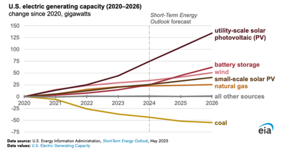 On the supply side, utility-scale solar capacity is set to soar, adding 130 gigawatts by 2026, while battery storage adds another 45 gigawatts and wind adds about 35 gigawatts. By contrast, coal capacity is expected to shrink by more than 60 gigawatts over the same period.